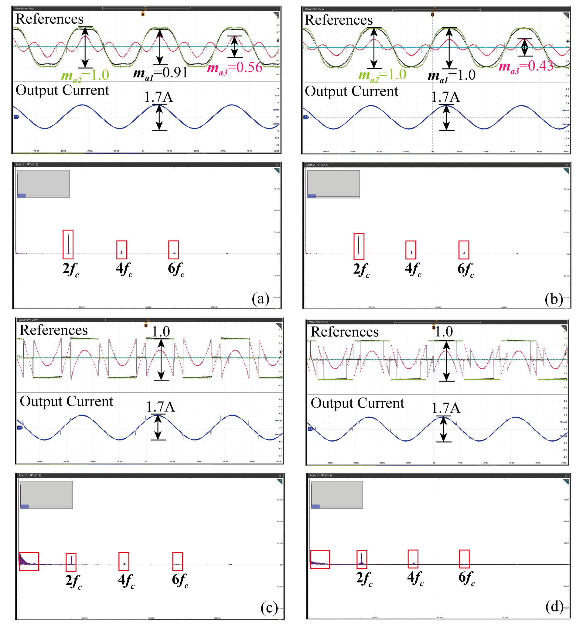 ๊ทธ๋ฆผ 24๋ SPWM ๊ธฐ๋ฒ์์ ๋ชจ๋ ๊ฐ ๊ท ํ ์กฐ๊ฑด๊ณผ ๋ถ๊ท ํ ์กฐ๊ฑด์ ์ง๋ น ์ ํธ์ ์ถ๋ ฅ ์ ๋ฅ ๋ฐ ์ฃผํ์ ์คํํธ๋ผ์ ๋ณด์ฌ์ค๋ค. ๊ทธ๋ฆผ 24 (a) 0.8๋ก ๊ท ํ์ ์ผ๋ก ๋ณ์กฐ๋ ๋ ์ฝ 1.7A๋ก ๋ํ๋๋ฉฐ ์ด๋ ์ฃผํ์ ์คํํธ๋ผ์์ ์ค์์นญ ์ฃผํ์์ 6์ฐจ ์ฑ๋ถ๋ถํฐ ๋ํ๋๋ค. ๋ฐ๋ฉด ๊ทธ๋ฆผ 24 (b)์์ ๋ชจ๋ 1์ 1.0์ผ๋ก ๋ณ์กฐ, ๋ชจ๋ 2๋ 0.8 ๋ฐ ๋ชจ๋ 3์ 0.6๋ก ๋ณ์กฐ๋ ๋ 2์ฐจ์ 4์ฐจ ์ฑ๋ถ์ด ์์ฑ๋๋ค. THD๊ฐ์ ๊ท ํ ์กฐ๊ฑด์์ 2.04%,