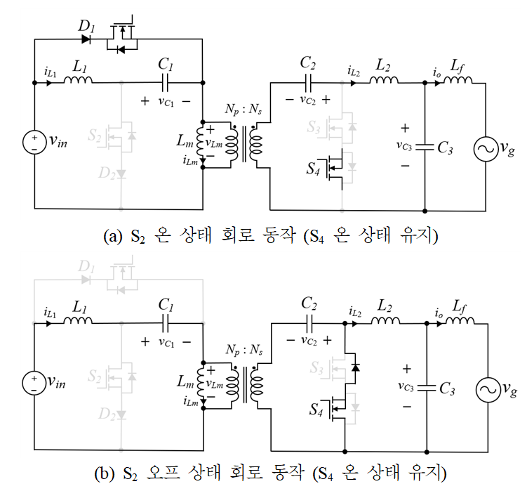 4-액티브 스위치 기반의 절연형 브릿지리스형 인버터의 출력전압이 양 반주기 구간인 경우(vg > 0), 정상상태 조건(Voltage second balance