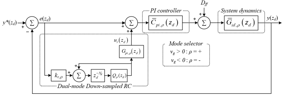출력 전압 극성에 따라 다른 시스템 특성을 보이기에 제어기 설계가 상당히 까다롭다. 본 논문에서는 이를 해결하기 위해 그림 5와 같이 다운 샘플링된 듀얼모드 반복학습제어기를 추가적으로 설계하도록 한다.