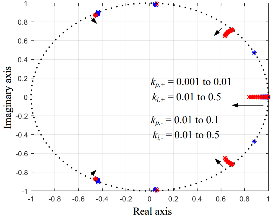 0.5까지일 때 극점이 단위원 내부에 위치한다. 여기서 적절한 이득 값 kp,+ = 0.005, kp,- = 0.05, ki,ρ = 0.2(ρ =+,-)를