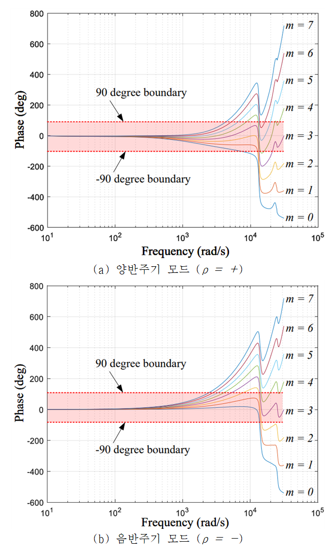 그림 9. 전달함수 ZmGcl(z)의 위상 그래프 (a) 양반주기 모드 (ρ = +) (b) 음반주기 모드 (ρ = -)