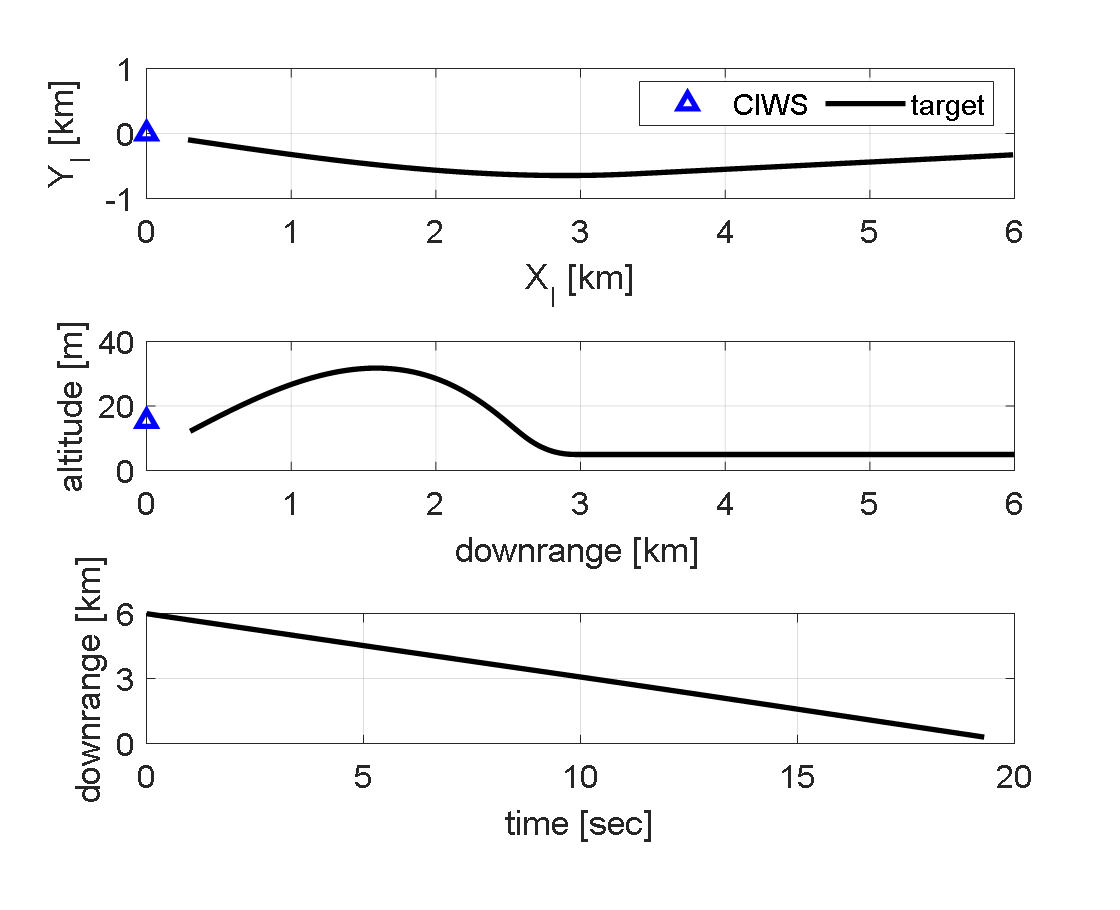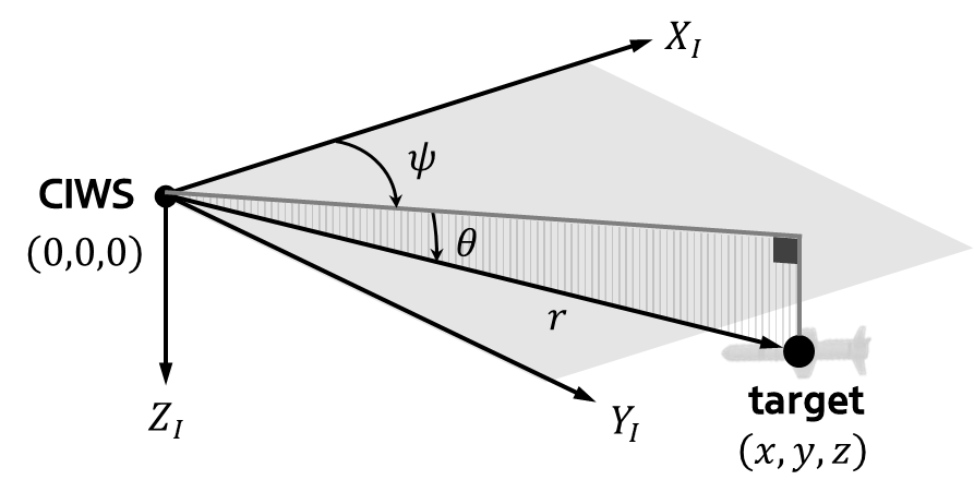 & dive) 등의 회피기동을 수행하는 경우가 대부분이다 [24]. 따라서 CIWS의 교전 범위 내에서는 $|\psi |\ll 1, |\theta |\ll 1, |\dot{\psi}|\ll 1$이 만족된다. 따라서