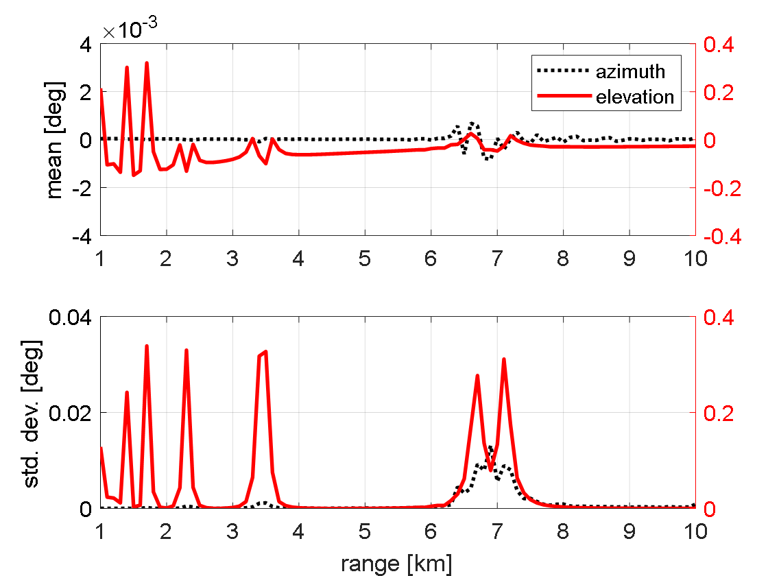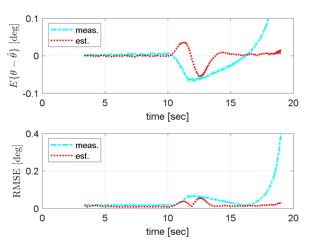 대한 사후추정치와 추정오차공분산을 의미한다. $t_{k}$시점 방위각 및 고각 추정치는 $\hat{\psi}_{k}\equiv \hat{\boldsymbol{\eta}}_{k|k}(1)$,