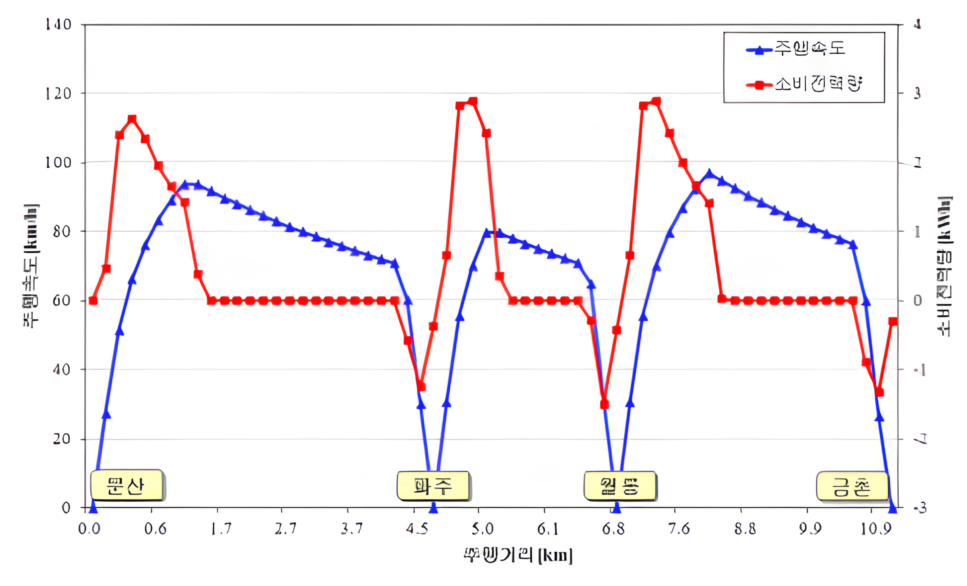 첫째 구동(견인) 계통: 가속·정속·감속 전 구간에서 견인전동기와 전력변환장치(VVVF-IGBT)가 소비하는 에너지로, 노선 구배/곡선, 정차 패턴,