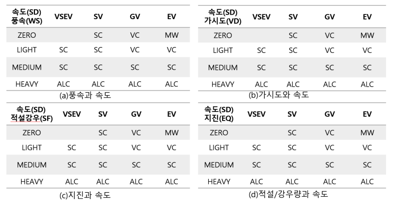 열차 운행속도 제어 규칙을 설명하면 가로는 속도(SD)변수이며, 세로 정보는 풍속(WS), 가시도(VD), 적설량/강우량(SF), 지진(EQ) 값이다.