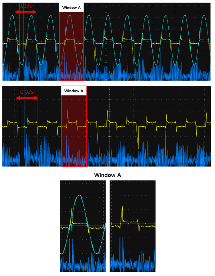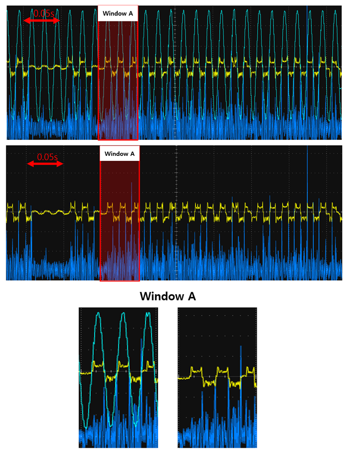 그림 13은 16A 조건의 전압과 전류, UVC 동시 파형을 제시한다. 앞에서와 동일하게 아크 형성 시 전류의 주기적 왜형과 UVC의 짧은 반복 펄스가 동시