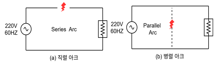 그림 2는 저압 분기회로에서의 아크 위치에 따른 동작 차이를 개념적으로 보인다. 직렬 아크는 느슨한 접속, 단선, 탄화 경로 등으로 부하와 직렬로 형성되며