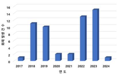소방청 통계자료에 따르면, 2017년부터 2024년까지 국내에서 보고된 ESS 화재 발생 건수는 55건으로 그림 1에 나타내었다[7]. 2017년 이후부터 ESS 화재가 급격히 증가하였다. 2018년과 2019년에는 각각 11건, 10건이 발생하였으며, ESS의 안전성 문제가 대두되었다.
