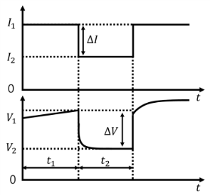 DCIR은 전류 스텝변화에 따른 전압 응답으로 식 (1)과 같이 계산된다.