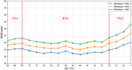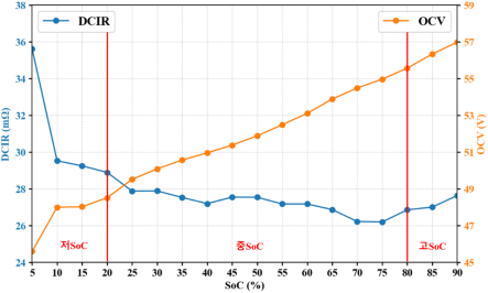 반면 중SoC(20~80%) 구간에서는 충·방전에서 가장 안정적인 내부저항 특성을 보였다.
