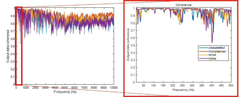 Fig. 10. Coherence between vibration sample by status. (Left) Coherence from 0Hz to