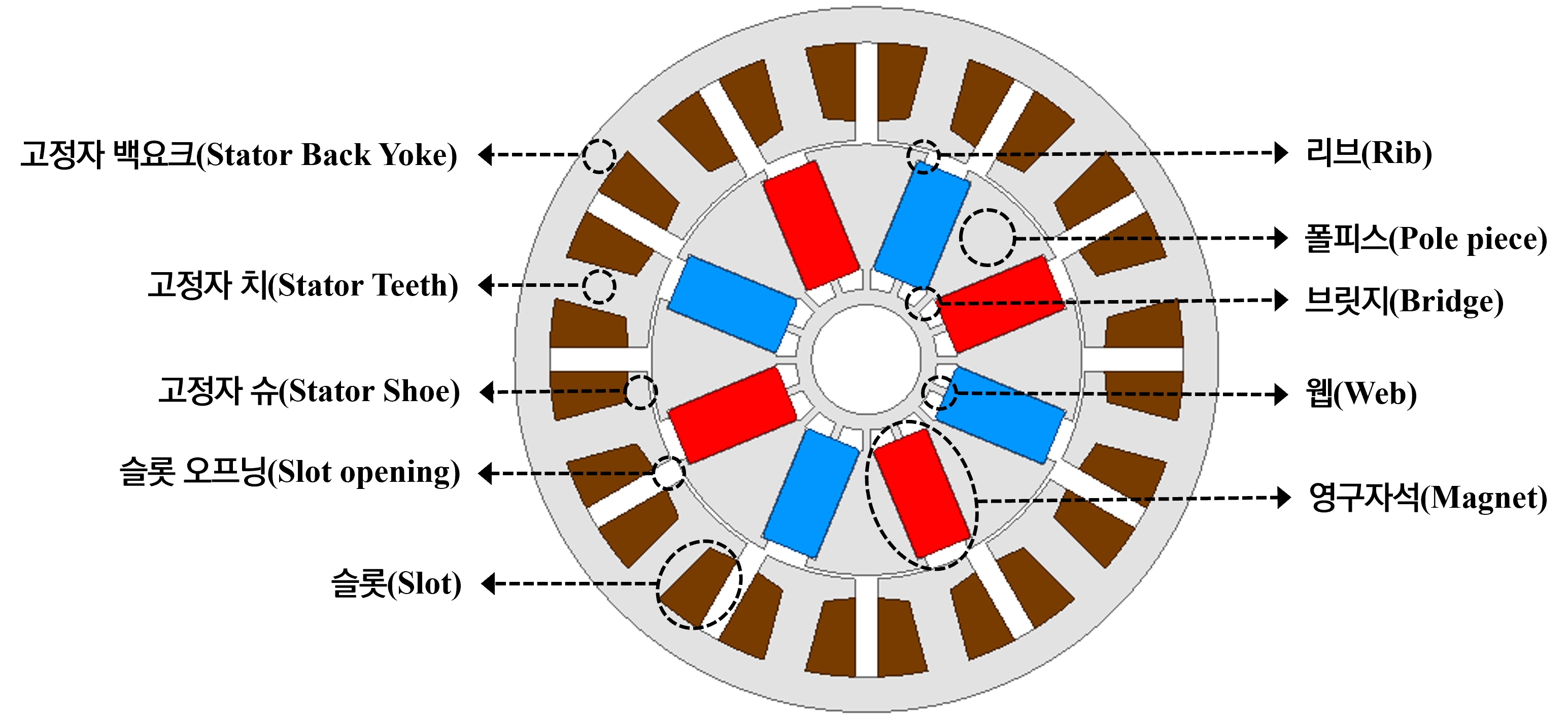 ์๊ตฌ์์ ์ ๋๊ธฐ์ ์ฃผ์ ๊ตฌ์ฑ ์์๋ฅผ ๋ํ๋ธ ๊ฒ์ด๋ค. ๊ณ ์ ์ ๋ถ๋ถ์ ๋ฐฑ์ํฌ(Stator Back Yoke), ์น(Stator