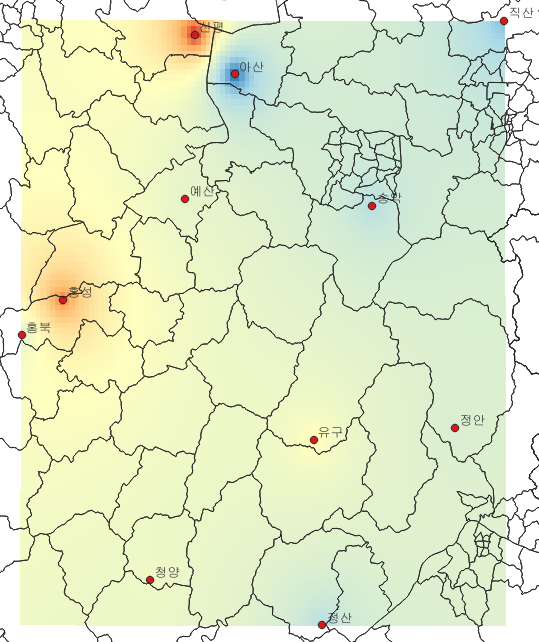 ์์น์ ๊ฐ์ผ๋ก ๋ณํํ๊ธฐ ์ํด ๊ณต๊ฐ ๋ณด๊ฐ๋ฒ์ ์ ์ฉ์ด ํ์ํ๋ค. ์ญ๊ฑฐ๋ฆฌ๊ฐ์ค๋ฒ (IDW, Inverse Distance Weighting)์ ๊ฐ๊น์ด ์๋