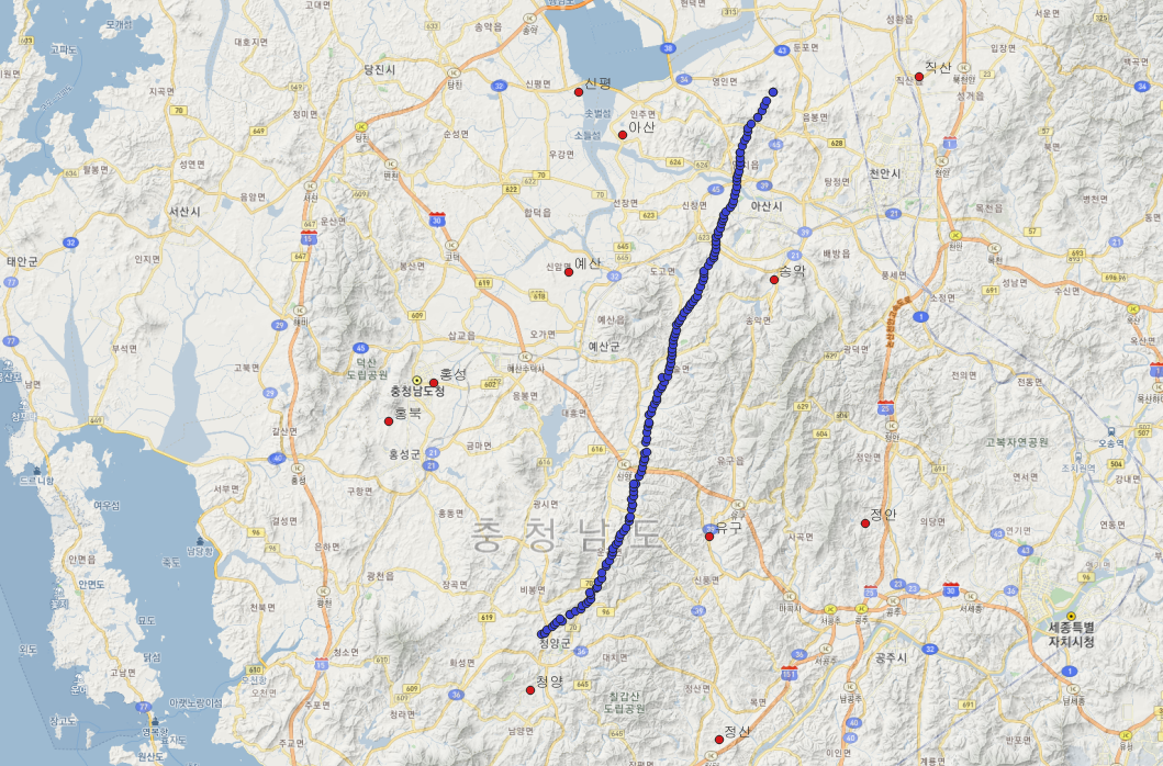 km ๋ฏธ๋ง์ ์์นํ ๊ธฐ์๊ด์ธก์์ ์ธก์ ์ ๋ณด์ ํ์ฉ, ์ด ๊ฐ๋ค์ ๊ฐ๊ณต ์ก์ ์ ๋ก ์์น๋ก ๋ณด์ ํ๊ธฐ ์ํด ์ญ๊ฑฐ๋ฆฌ๊ฐ์ค๋ฒ (IDW, Inverse Distance