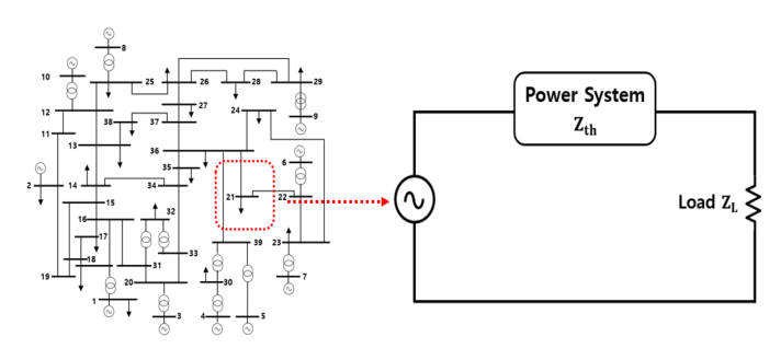 PSS/E ํด์ ์ด์ฉํ์ฌ ๋ณต์กํ ์ ๋ ฅ๊ณํต ๋คํธ์ํฌ์์ ๊ด์ฌ ๋ชจ์ ์ ์ ์ ํ๊ณ , ํด๋น ๋ชจ์ ๊ด์ ์์ ๊ณํต์ ๋ฑ๊ฐํํ๋ฉด ๊ทธ๋ฆผ 4์ ๊ฐ์ด ๊ณํต์ Thevenin ๋ฑ๊ฐ ์ํผ๋์ค์ ๋ถํ ์ํผ๋์ค๋ก ํํํ ์ ์๋ค. ์ด๋ ๊ด์ฌ ๋ชจ์ ์์ ๋ฐ๋ผ๋ณธ ์ ๋ ฅ๊ณํต์ Thevenin ์ํผ๋์ค๋ฅผ
