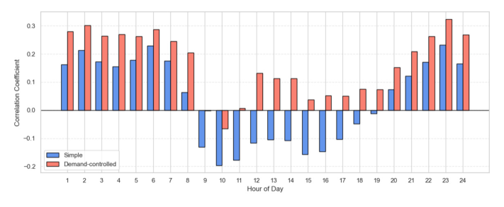 그림 16-18은 PBP 시장에서 전력수요의 영향을 제거한 후, 재생에너지 발전량과 SMP 간 순수한 상관관계를 시간별 부분 상관계수로 시각화한 결과이다. CBP