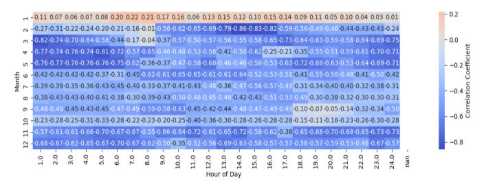 시간대에서 절댓값 0.6 이상의 강한 음의 상관관계가 관찰되었으며, 겨울철 1월의 경우 유일하게 음의 상관관계가 거의 나타나지 않았다. 이는 겨울철