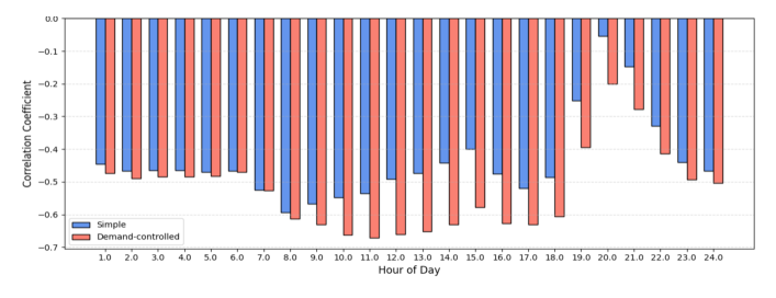 PBP 시장 분석에서는 모든 시간대에서 강한 음의 상관관계가 나타나, 태양광 외에도 풍력 등 기타 재생에너지 자원의 영향성을 확인할 수 있었다. 반면,