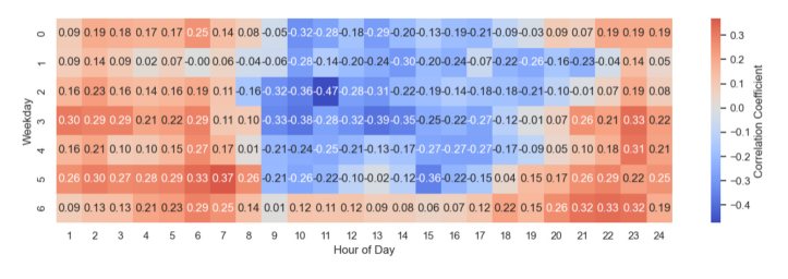 그림 16. 재생에너지 발전량과 SMP의 요일-시간별 부분 상관계수
