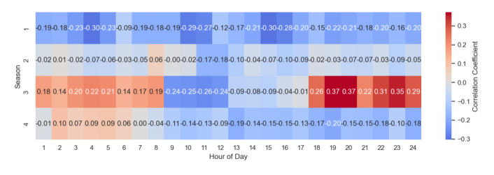 그림 18. 재생에너지 발전량과 SMP의 계절-시간별 부분 상관계수