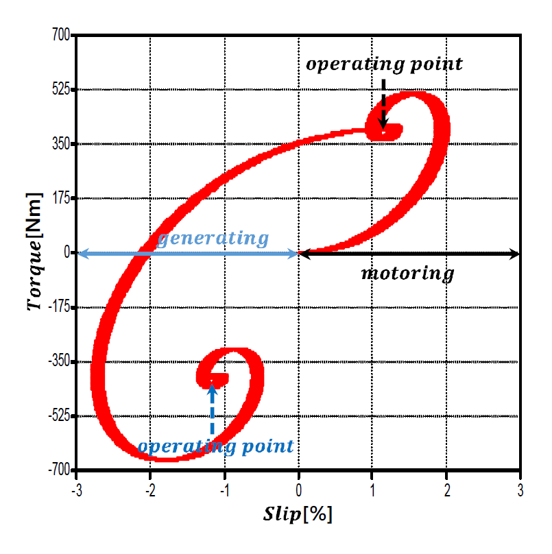 유도기는 동기속도($N_s$)와 회전자의 회전속도($N$)에 따라 전동기 운전($N < N_s$) 및 발전기 운전($N > N_s$)이 모두 가능하다[3,