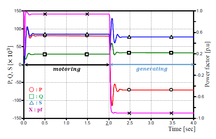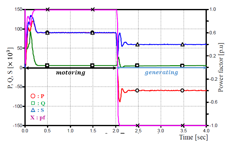 크기라도 발전기로 운전할 때의 역률이 전동기로 운전할 때보다 낮음을 확인하였고 이에 따라, 전동 모드보다는 발전 모드 운전에 필요한 무효전력의 보상량을