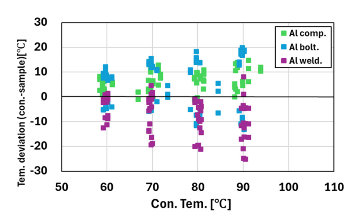 그림 12와 13에서는 각 시료별 샘플 #1, #2, #3 모두 사용하였으며 x축은 기준 도체 온도, y축은 기준 도체와 샘플간의 온도 편차를 나타낸다. 알루미늄