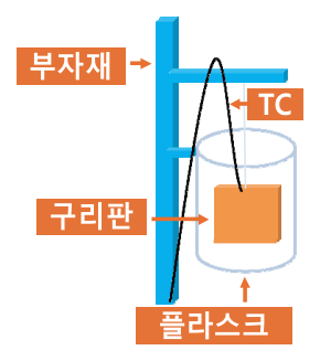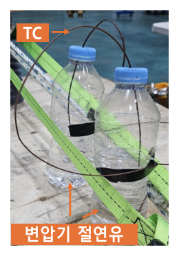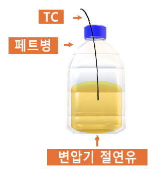 방법은 그림 5과 같이 위아래가 뚫려있는 플라스크 안에 구리판이 들어가도록 하고 그때 구리판을 TC를 이용하여 주위온도를 측정하는 방법이다. 그림 6은 현장에서 주로 사용되는 방법이다. 페트병안에 절연유를 넣고, 그 절연유의 온도를 TC로 측정하는 방법이다. 두 측정방법은 최대 약 0.1℃의 차이로