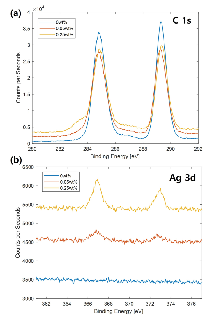 또한, 그림 3(b)에 나타낸 Ag 3d 영역을 분석한 결과, SNW가 첨가되지 않은 0wt% 샘플에서는 피크가 검출되지 않았다. 반면, SNW가 첨가된 0.05wt%와