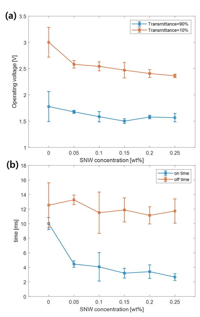 2.65ms로 감소하는 경향을 보였으며, 이는 SNW 첨가로 인해 액정셀 내 전계 분포가 변화했기 때문으로 추정된다. 반면, Off-time은 12.53ms,