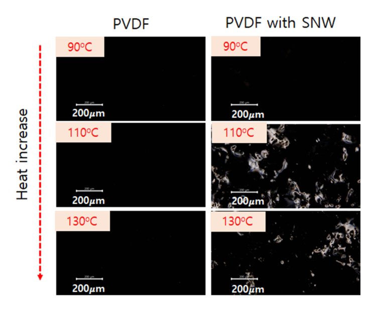 그림 8은 PVDF 박막과 SNW-PVDF(0.25wt%) 박막으로 제작한 액정 소자의 열적 안정성 테스트 결과를 보여준다. 열처리 온도는 90℃부터 130℃