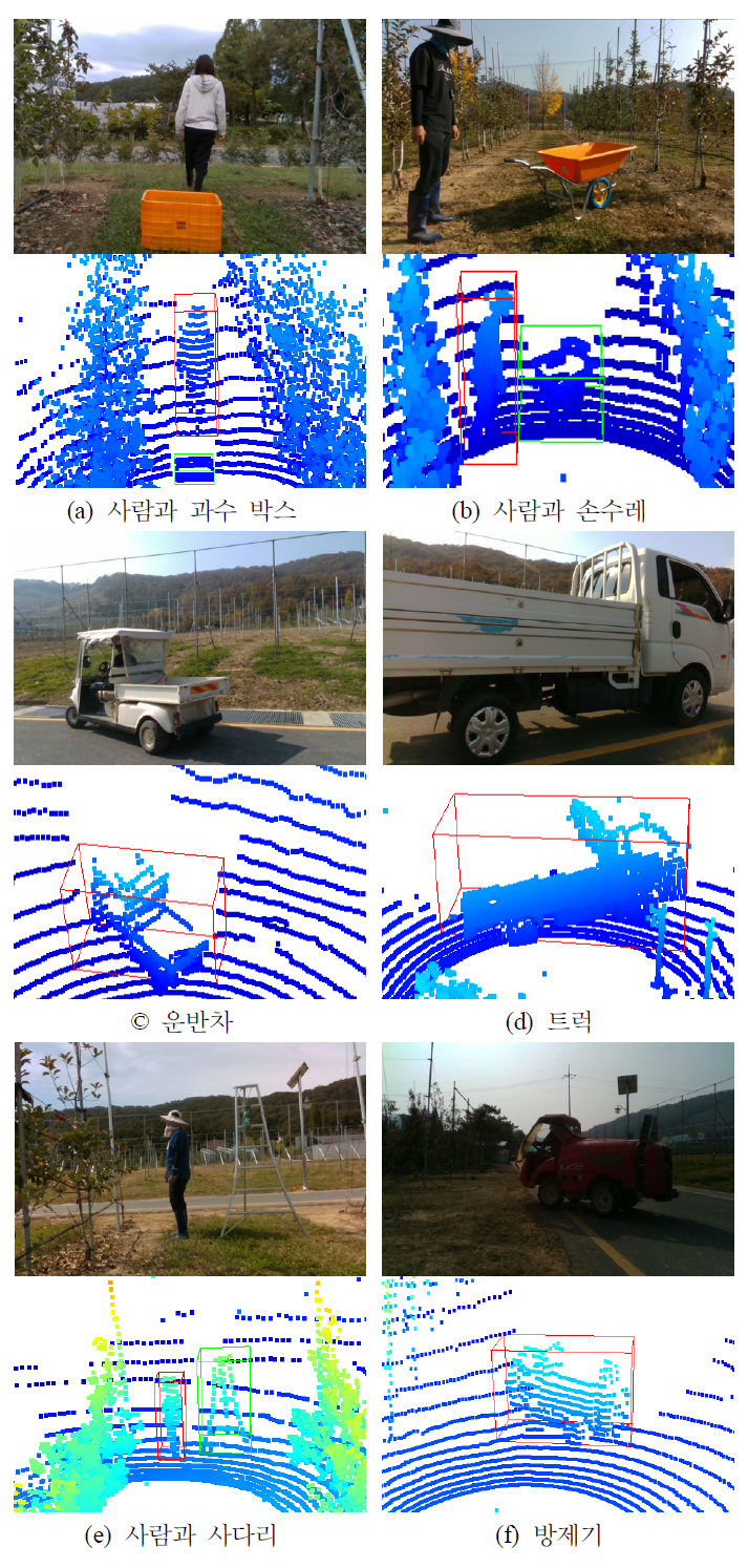 과수 박스, 사람과 손수레, 운반차, 트럭, 사람과 사다리 방제기의 이미지와 포인트 클라우드 데이터, 그리고 cuboid 형태의 label 예시를