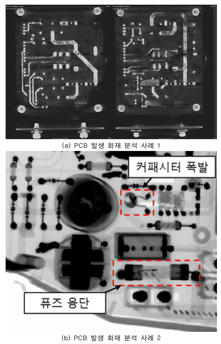 PCB가 설치된 전기‧전자제품의 경우 이물질, 수분으로 인한 부분 소실, 특정 소자의 소손, 과전류 인입 여부 등을 X-ray 분석을 통해 화재원인