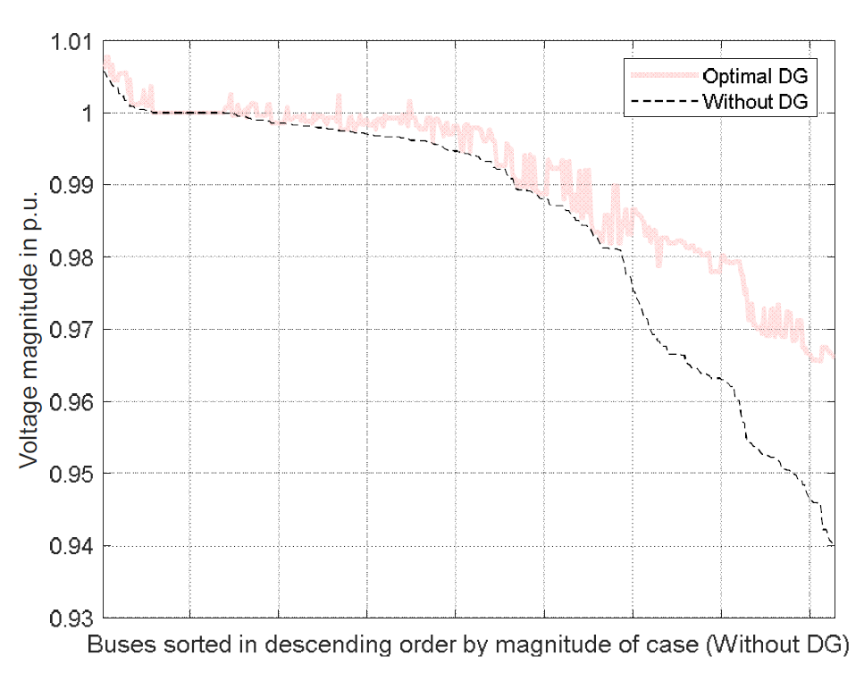Fig. 6. Voltage magnitude changes induced by maximum DG HC (1.6 p.u.)