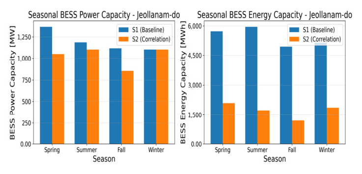 비해 상관관계 가중치를 도입한 시나리오(S2)는 BESS 에너지 용량이 유의미하게 감소하는 경향을 보였다. 또한 재생에너지 규모 차이를 보정 하여
