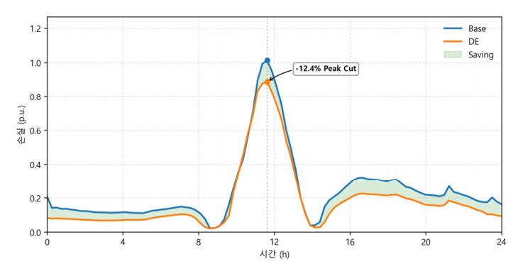 구간 전반에 걸쳐 손실 수준이 기존의 가중계수 대비 낮게 유지되며, 특히 정오 시간대에서 손실 피크가 12.4% 감소하였다. 일일 총손실은 기존의