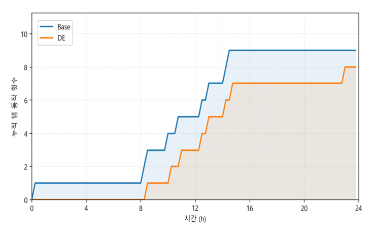 적용한 경우 누적 탭 동작 횟수는 8회로 감소함을 확인할 수 있다. 두 경우 모두 주로 부하 및 발전 변동이 크게 발생하는 시간대에서 탭 동작이 집중되는