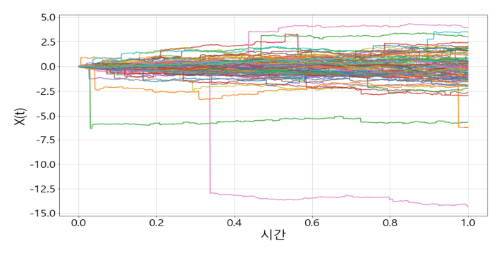 적합하다. 특히 금융 시장에서 자산 가격의 급등락을 모델링하기 위한 점프-확산 모델의 이론적 기반으로 널리 연구되어 왔다 [15]. 그림 1은 점프가 포함된 레비 프로세스의 경로를 보여주는 예시이다.