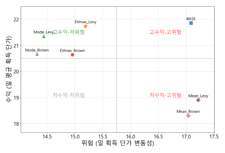 단가 변동성도 가장 큰 고수익·고위험 군에 위치한다. EVmax_Levy와 Mode_Levy는 BASE보다 낮은 평균 단가를 기록하면서 위험 수준은