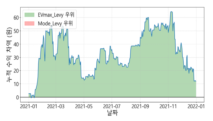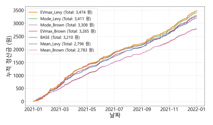 더 낮은 쪽으로 이동해 있어 상대적으로 수익의 안정성이 높은 것으로 분석된다. 그림 12는 2021년 연간 누적 정산금의 시계열 추이를 나타낸다. 그림 12의 범례는 최종 누적 정산금 순위대로 전략을 나열한다. 누적 정산금 궤적을 보면, 그림 11의 위험-수익 분석에서 고수익·저위험 영역에 위치했던 EVmax_Levy와 Mode_Levy 전략이 연중 내내 상위권 궤적을 유지하며 최종적으로 가장