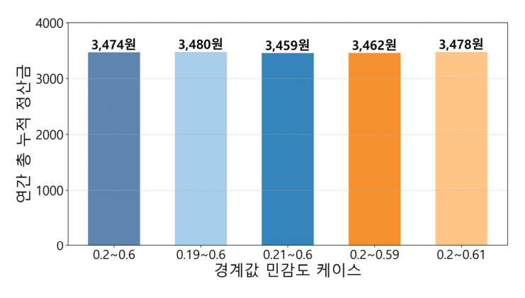 결과를 나타낸다. 동일한 학습, 시나리오 생성, 최적화 절차와 하이퍼파라미터를 유지한 채 경계값만 변화시켰을 때, 연간 누적 정산금은 3,459원
