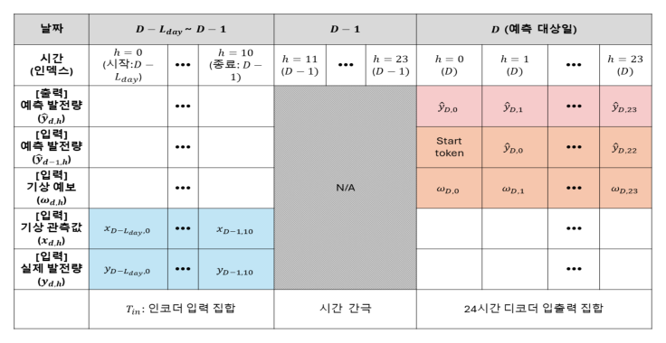 본 연구에서는 위 수식의 $\mu(t)$를 도출하기 위해, 과거 기상 관측 데이터와 과거 발전량 그리고 기상 예보 데이터를 입력으로 하는 Seq2Seq