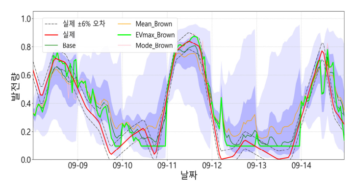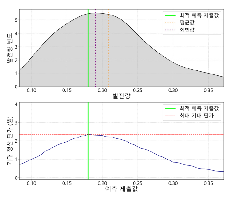 예측 모델로부터 비정규·비대칭 특성을 반영한 예측 분포를 구성하고, 이를 계단형 정산 단가 구조 기반의 경제적 최적화를 결합한 통합 확률론적 예측값
