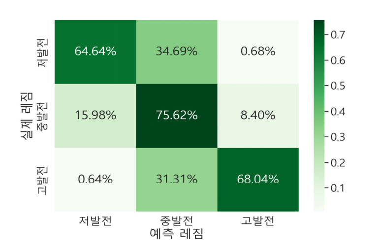 정분류율 75.62%, 고발전 정분류율 68.04%를 가중평균하여 산출한다. 저발전과 고발전이 중발전으로 예측되는 오분류가 상대적으로 많이 나타나며,