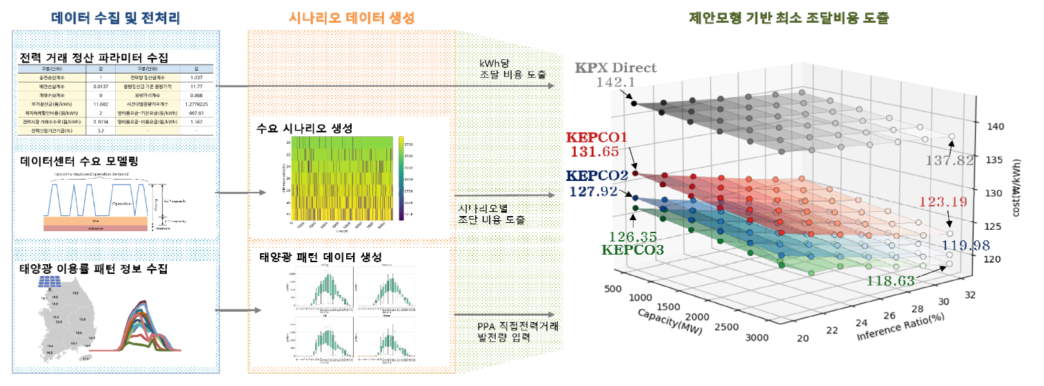 재생에너지 발전량 시나리오를 생성한다. 마지막으로 생성된 AI 데이터센터 수요 시나리오와 태양광 발전량 시나리오를 입력으로 하여 연간 전력 조달 비용을