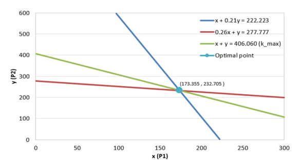 직선 형태로 표현하였다. 이때 강건도 판단 기준을 만족하는 영역에 대하여 x+y가 최대가 되는 교점을 최적점으로 선정하고, 해당 교점의 좌표값을 각각