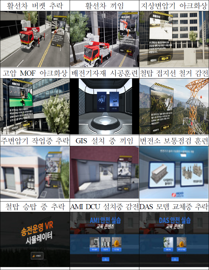 체험, 25.8kV GIS 설치 중 끼임사고 체험 등을 포함하였다. 고전압 설비 작업 특성상 감전 및 추락 위험이 상존하는 작업 환경을 가상 시나리오로