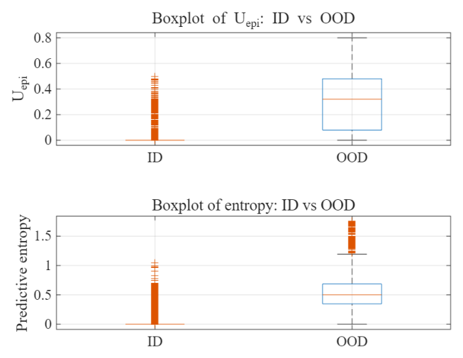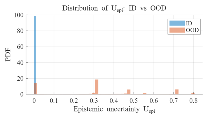 이는 제안된 앙상블 모델에서 ID 샘플 대부분이 $U_{epi} = 0$ 부근에 집중되어 있고, OOD 샘플은 상대적으로 높은 불확실성 영역으로 분리되어