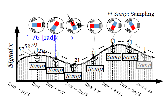 여기서 k는 1, 11, 21, 31, 41, 51로, 그림 3에 해당 인덱스들의 위치가 표시된다. $\omega_{rm}$은 회전자의 rad/s로 나타낸 기계각 속도이고, $T_e^*$는 토크 지령 값을 의미한다.