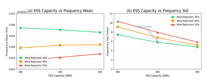 이는 ESS의 가용 에너지 용량이 충분할수록 전력 불균형을 효과적으로 완화할 수 있음을 의미한다. 이러한 결과는 ESS 용량이 주파수 안정화 성능에